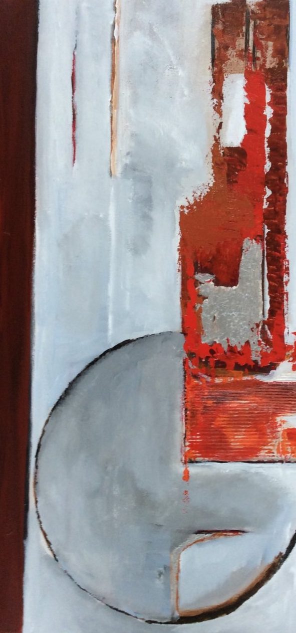 Schilderij ,in grijs-en roodtinten ,met zilver,op doek