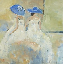 Een globale impressie van het schilderij "Blauwe hoedjes" 100x100cm.