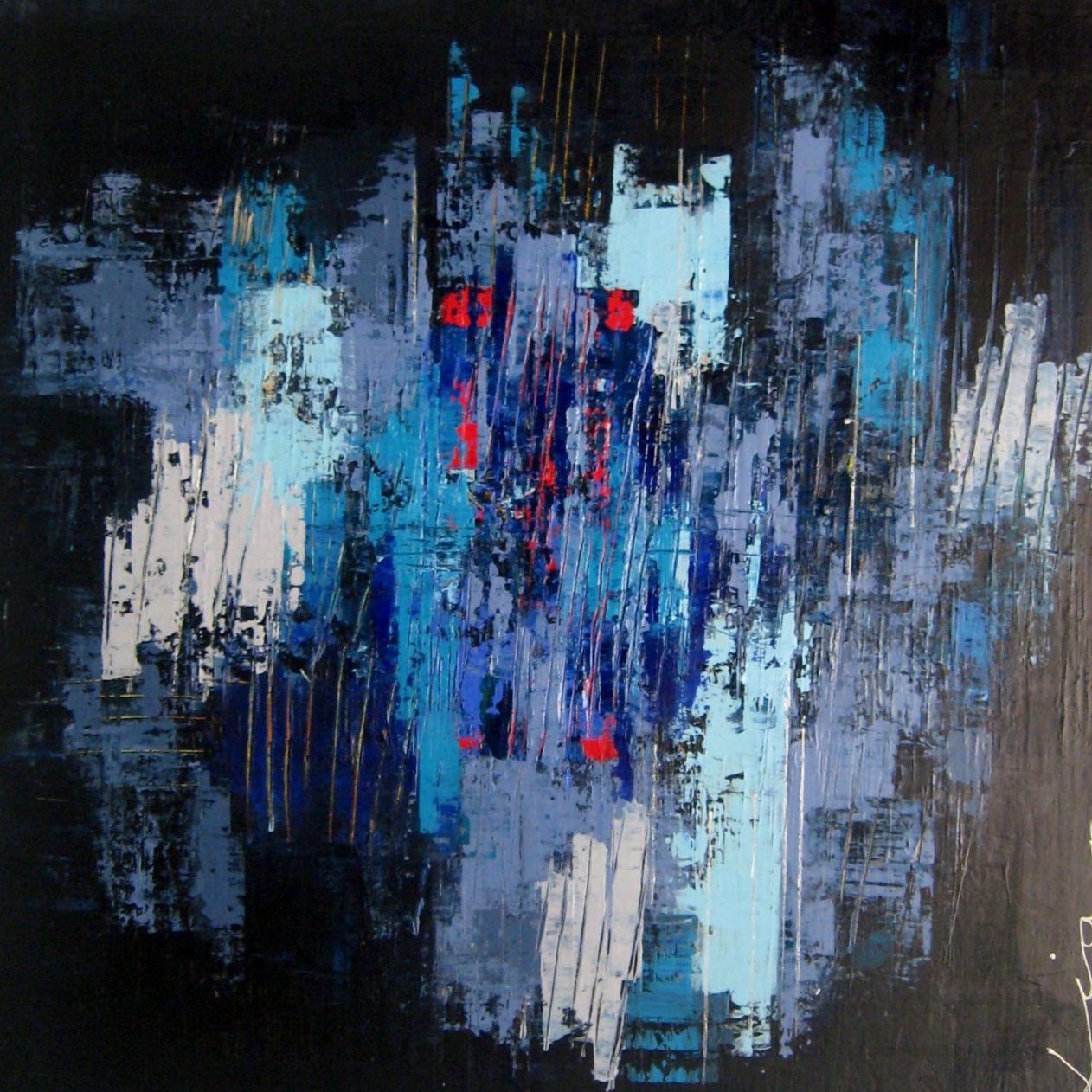 Abstract werk met paletmes geschilderd. opgebouwd uit diverse lagen. Blauwtinten met rode accenten