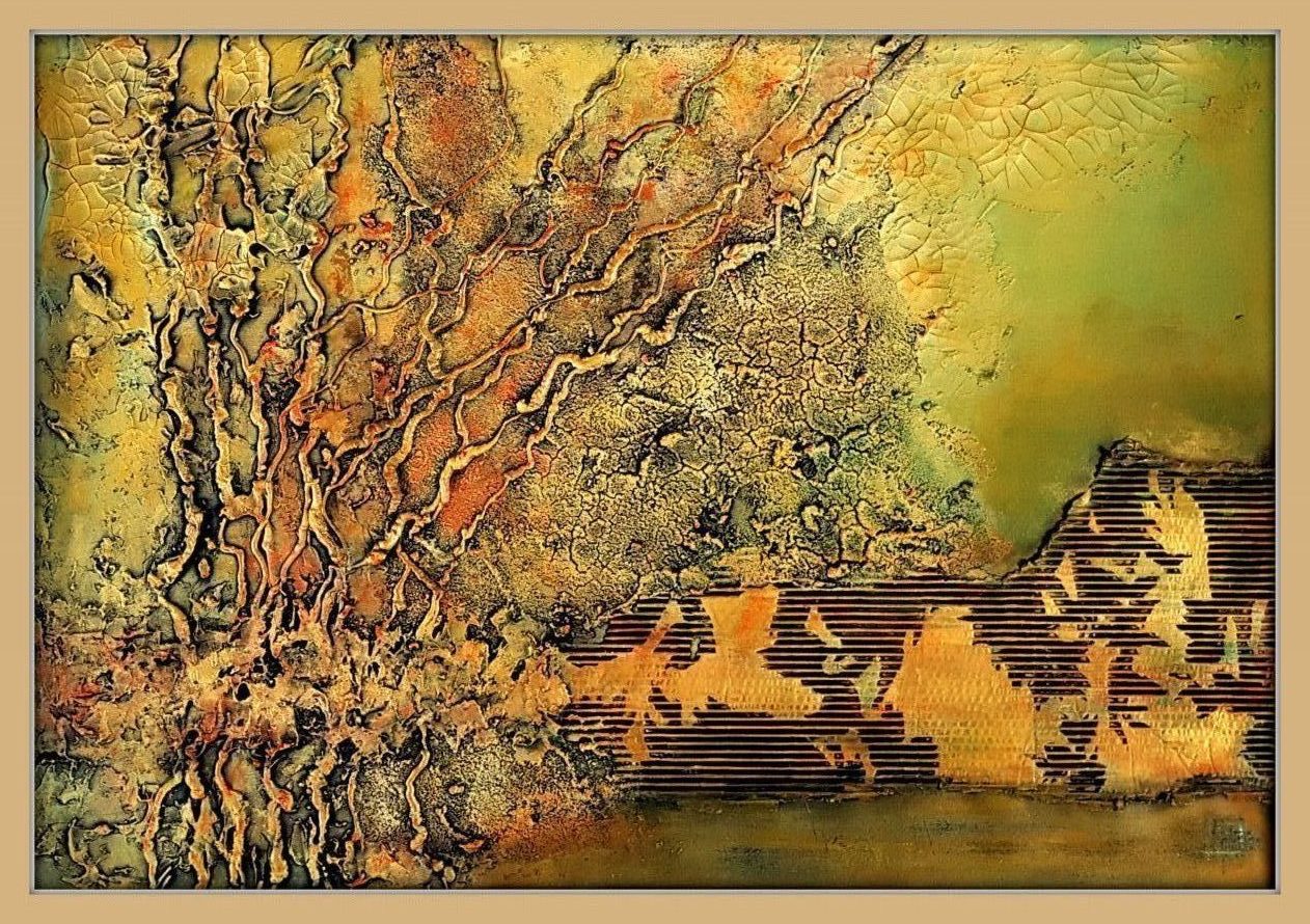 Materieschilderij met veel textuur in warme kleuren inclusief brede houten lijst afmeting is inclusief lijst