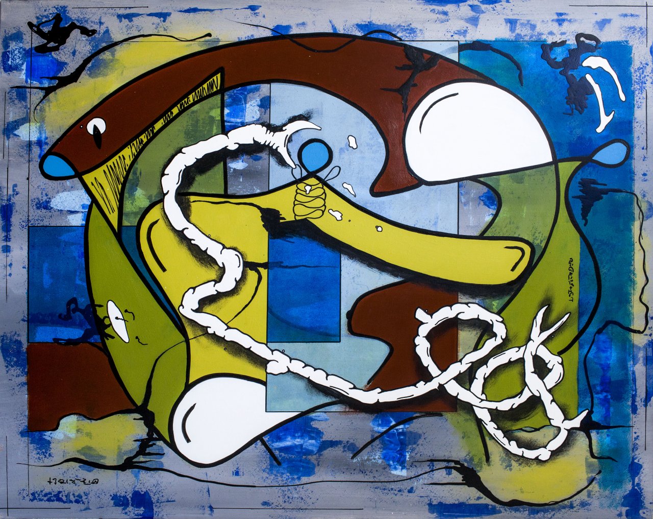 I will share it with you, provided you are careful with it is een abstract modern schilderij. Acrylverf op paneel (ingelijst met een zwart strak modern lijst)