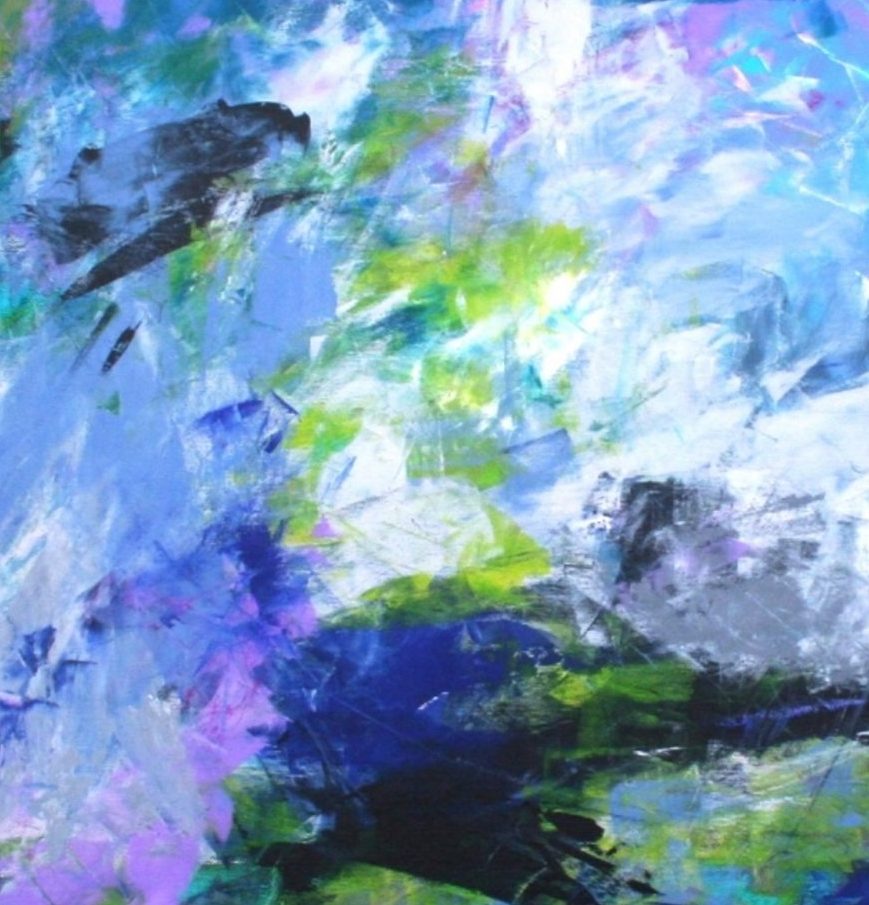 Een globale impressie van het schilderij "Wat vliegt daar" 60x60cm.