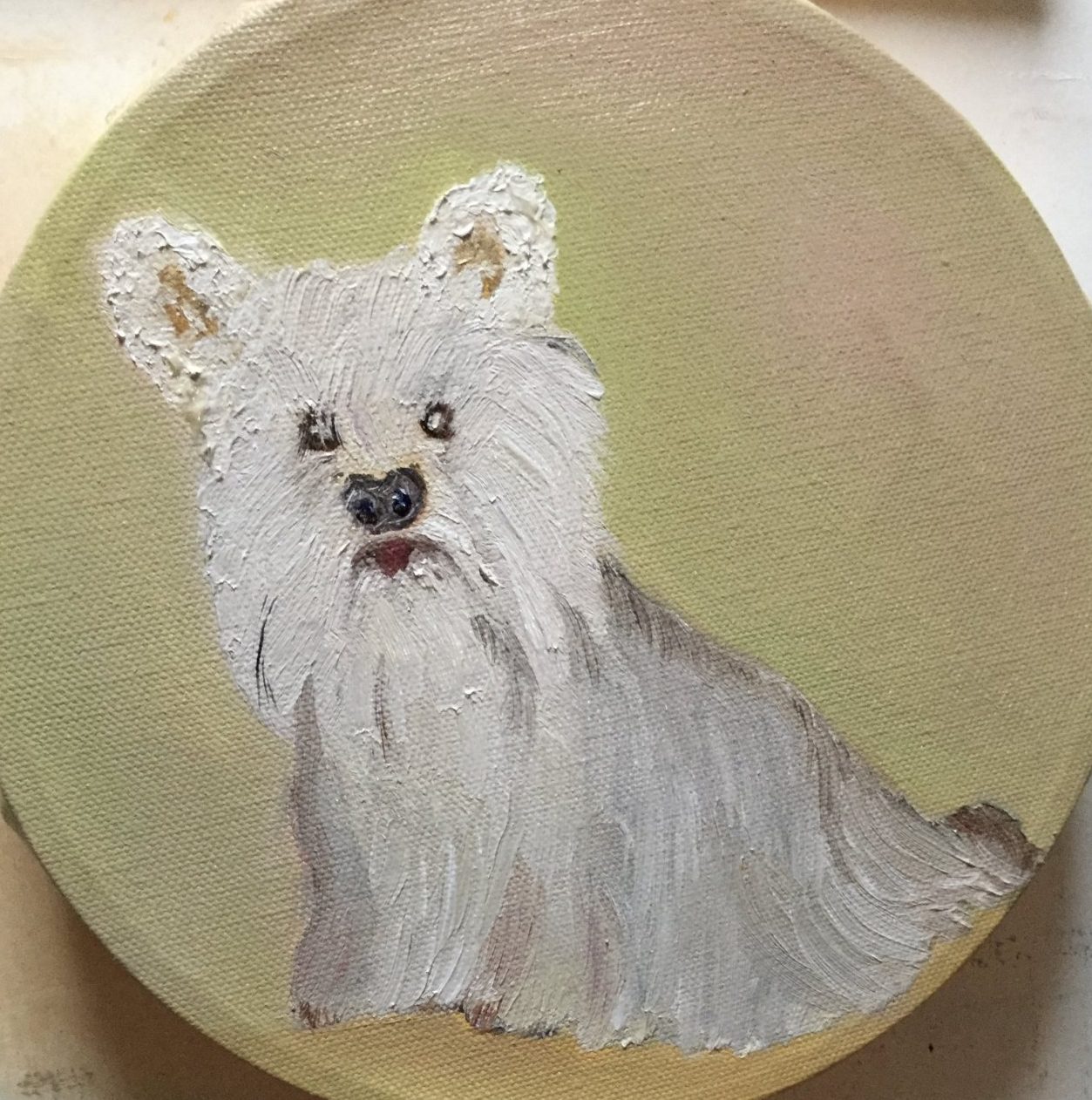 Olieverf schilderij vettig geschilderd haar hondje komt er goed voor