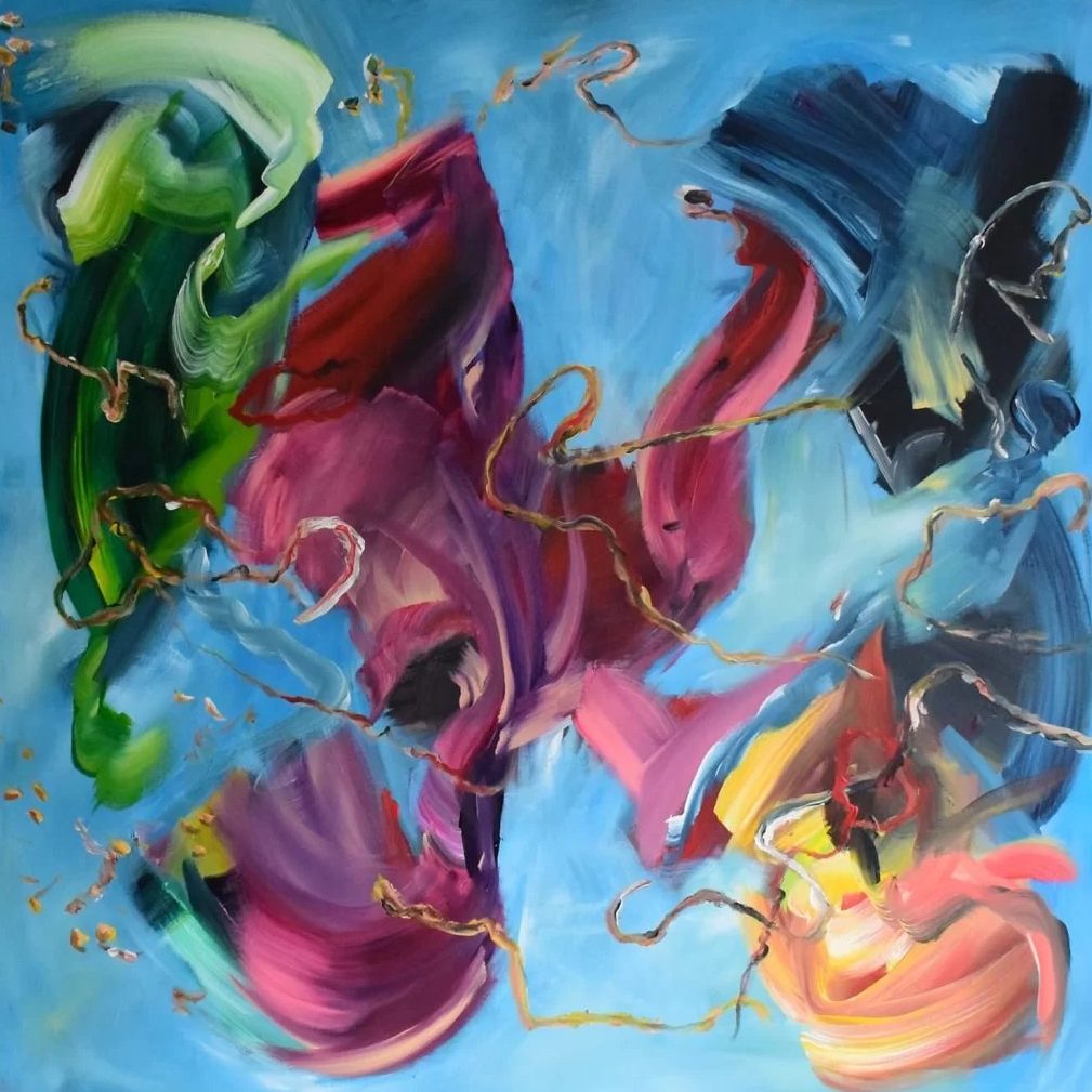 Een globale impressie van het schilderij "Shake it up baby" 100x100cm.