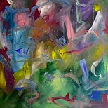 Een globale impressie van het schilderij "Bad hair day" 90x90cm.