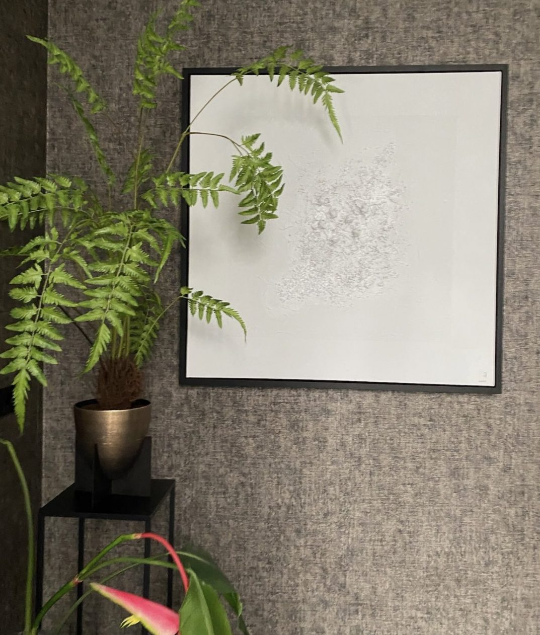 Only White schilderij mixed media .105x105 cm. Incl .zwarte lijst.
