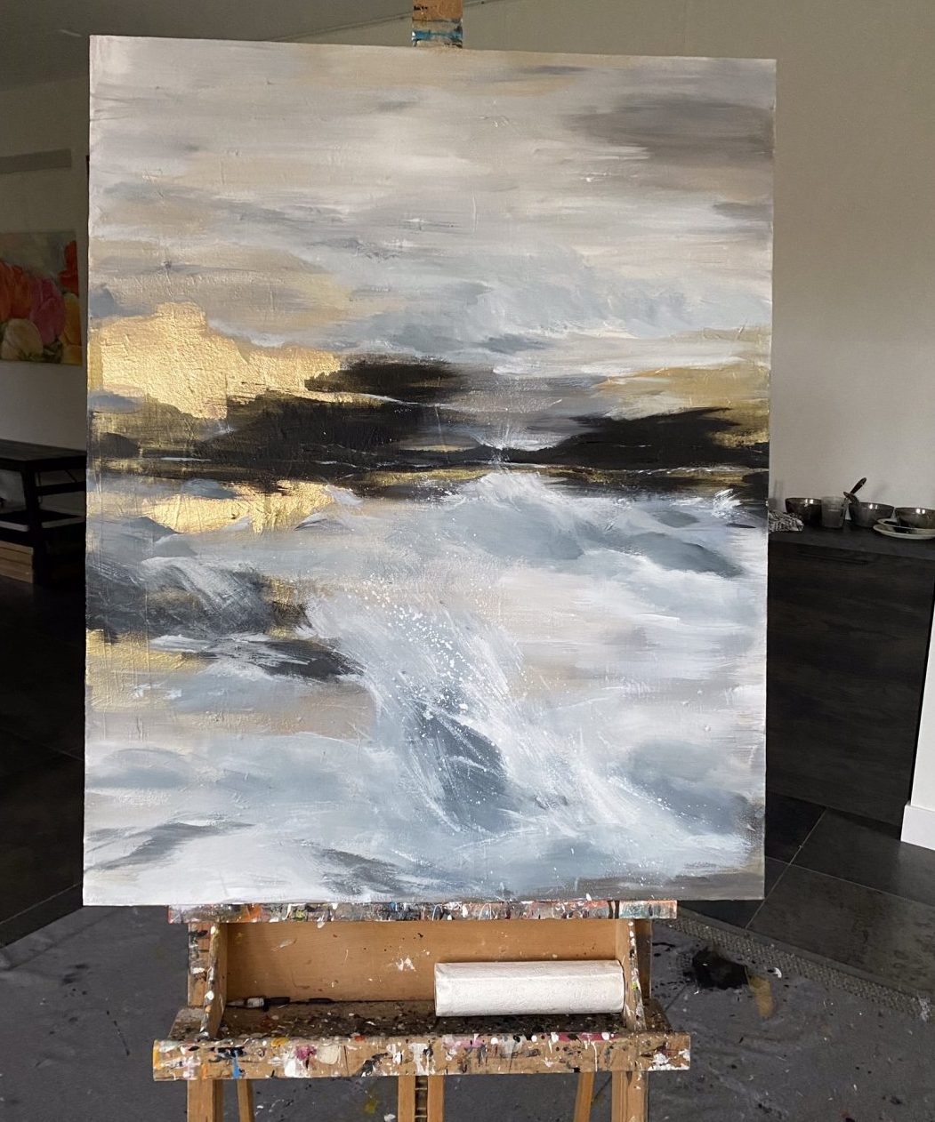 Geïnspireerd door het verblijf op Lanzarote.mixed media . Acryl ,bladgoud op 3D doek. Afgewerkt met mat vernis