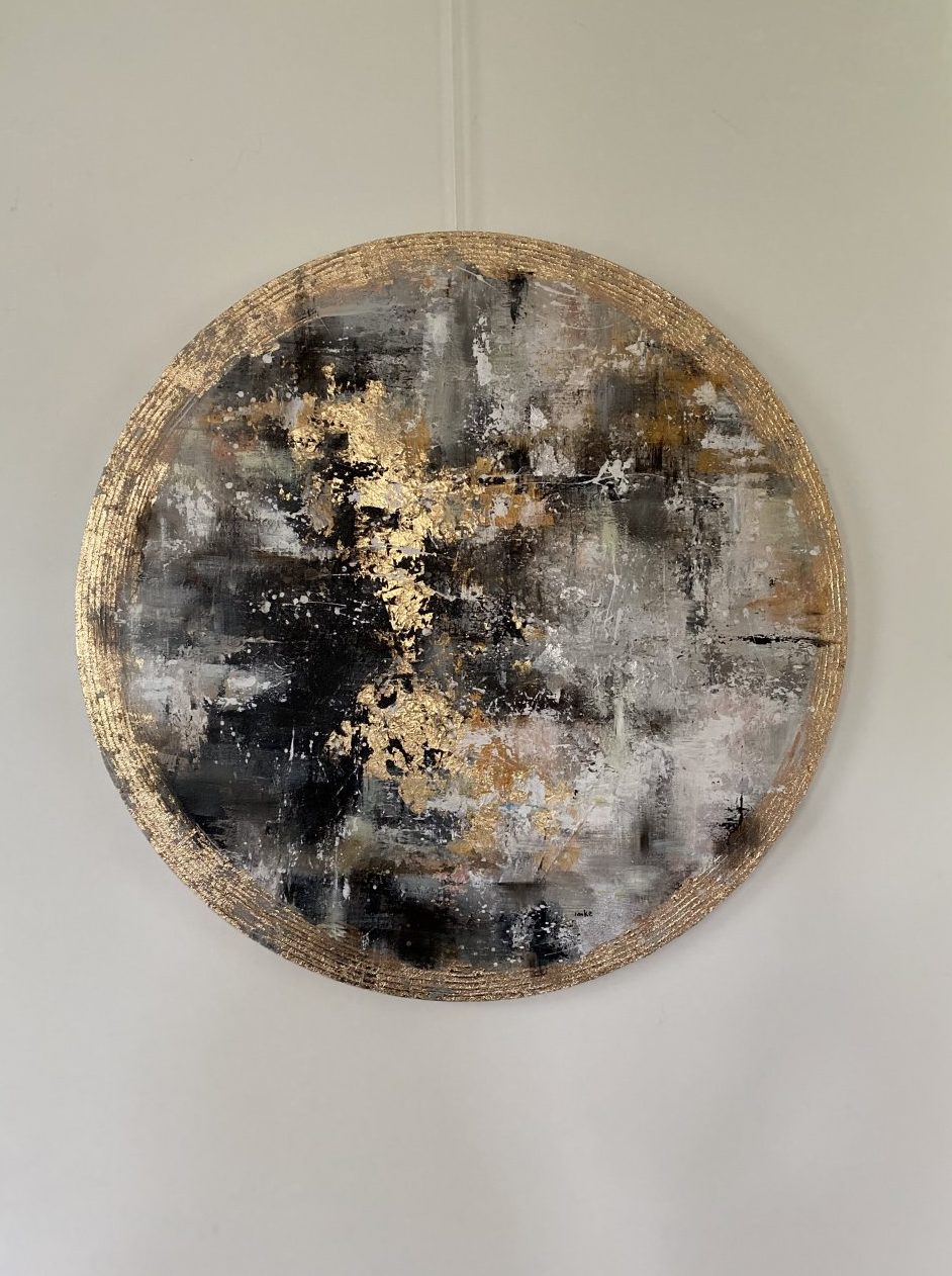 Rond canvas doek , mixed media art, met goud blad ,structuur pasta , ,acryl verf, afgewerkt met satin vernis . Rand afwerking met bladgoud. En ophang systeem.