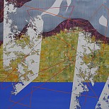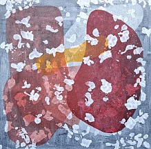 Abstract schilderij uitgevoerd in olieverf en inkt op linnen Het werk is ingelijst in een stalen baklijst en gesigneerd